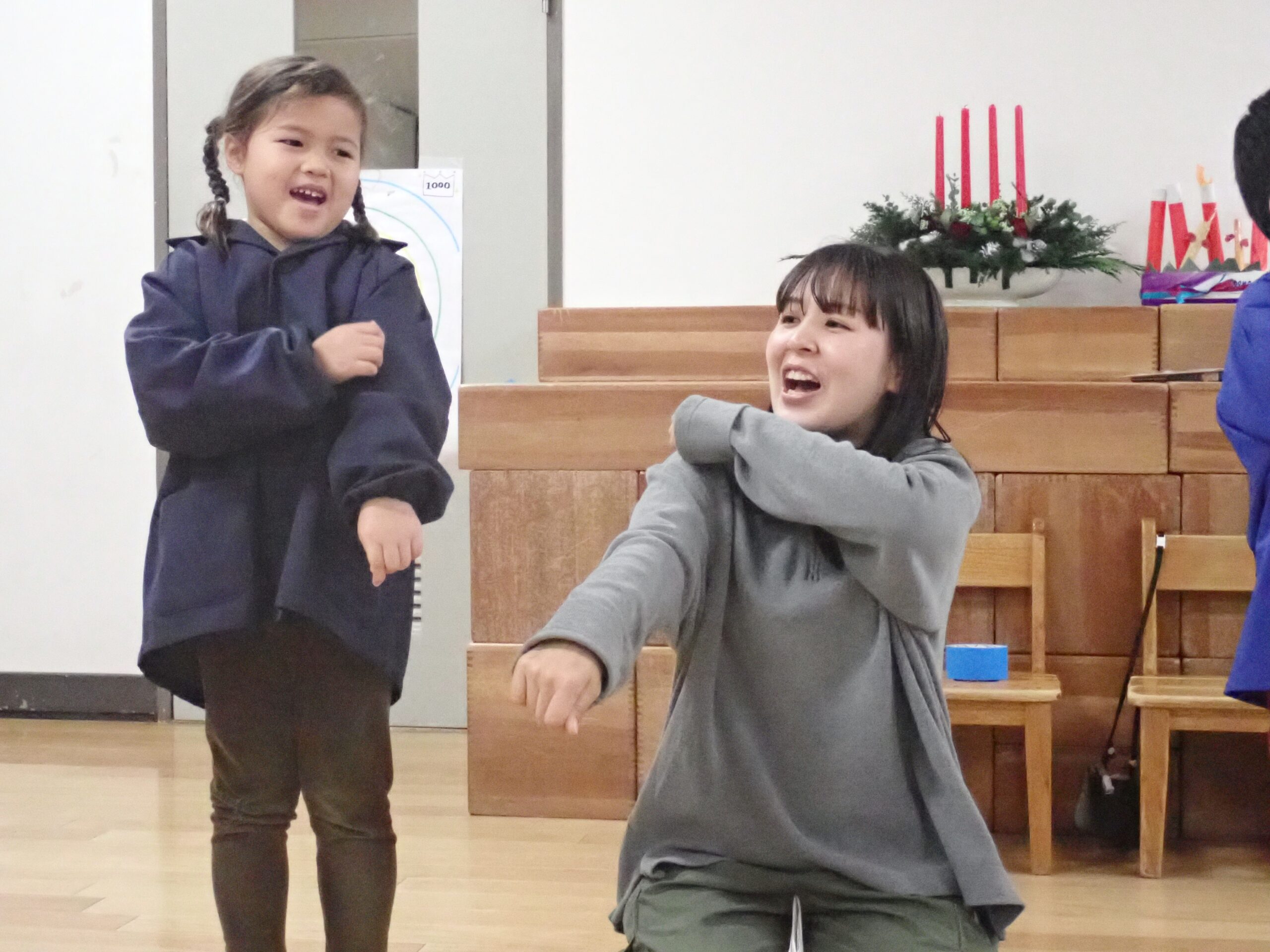 城西幼稚園のクリスマス会は、お遊戯会ではなく、イエス様のお誕生をみんなで楽しくお祝いする会としているので、子どもたちが無理やりやったり厳しくセリフを覚えたりはしません。先生と一緒に楽しみながら自然と覚えていくようにしています。