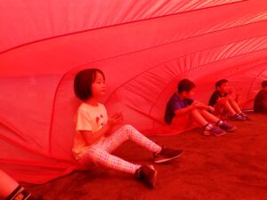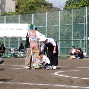 年長さんは、最後の運動会です。バトンタッチやパラバルーンといった競技だけではなく小さなお友だちの競技のお手伝いもしてくれました。