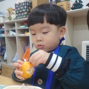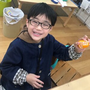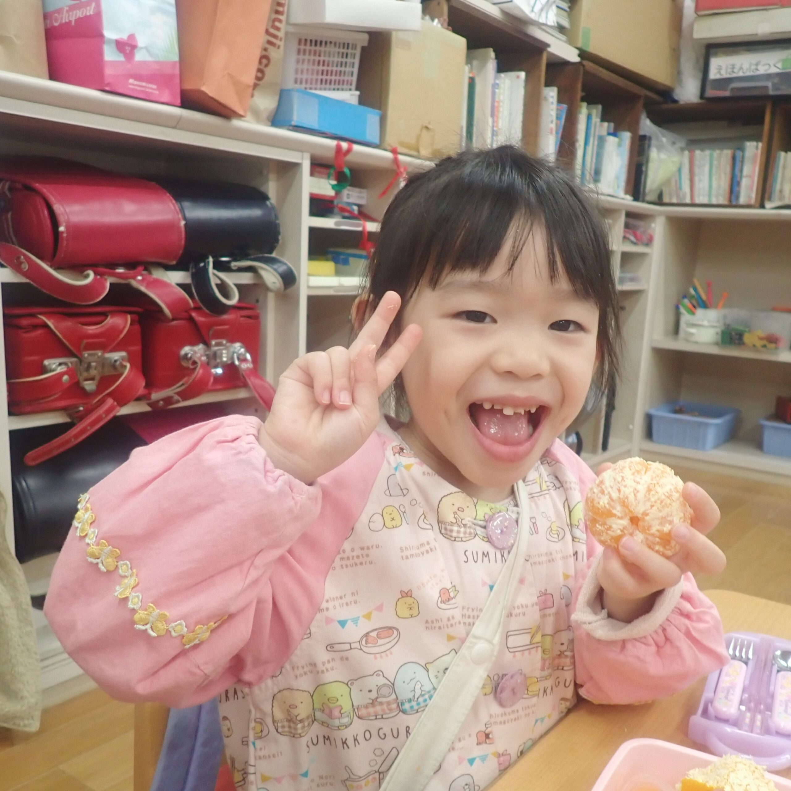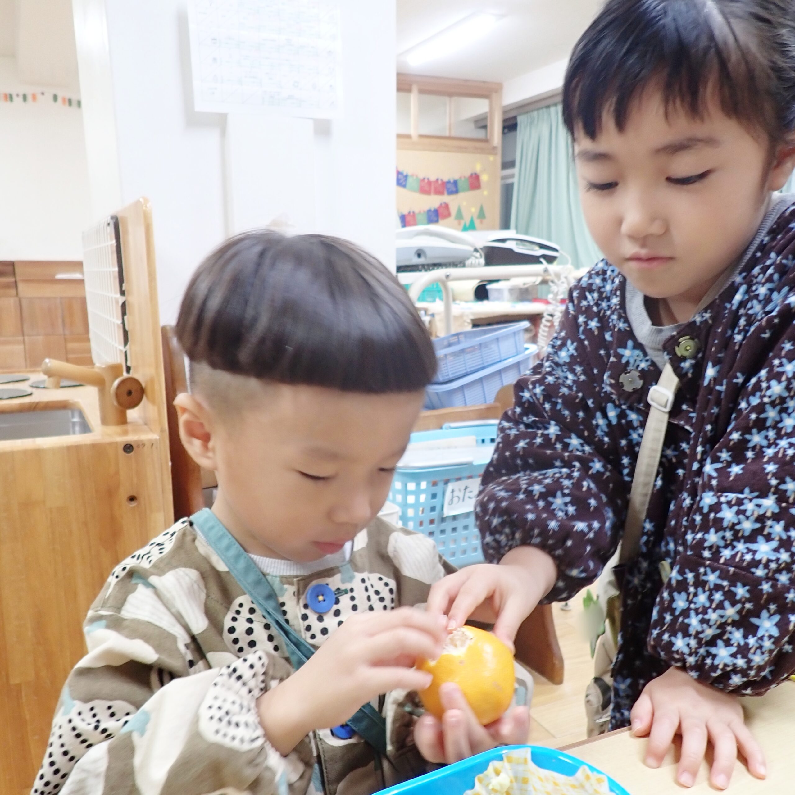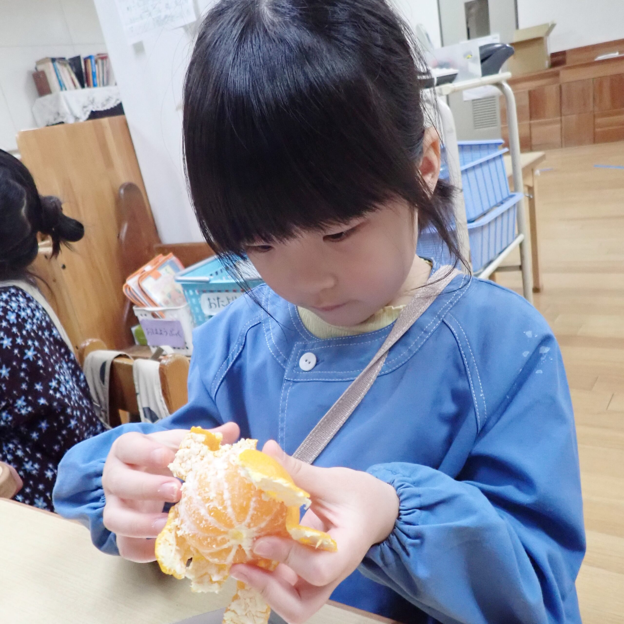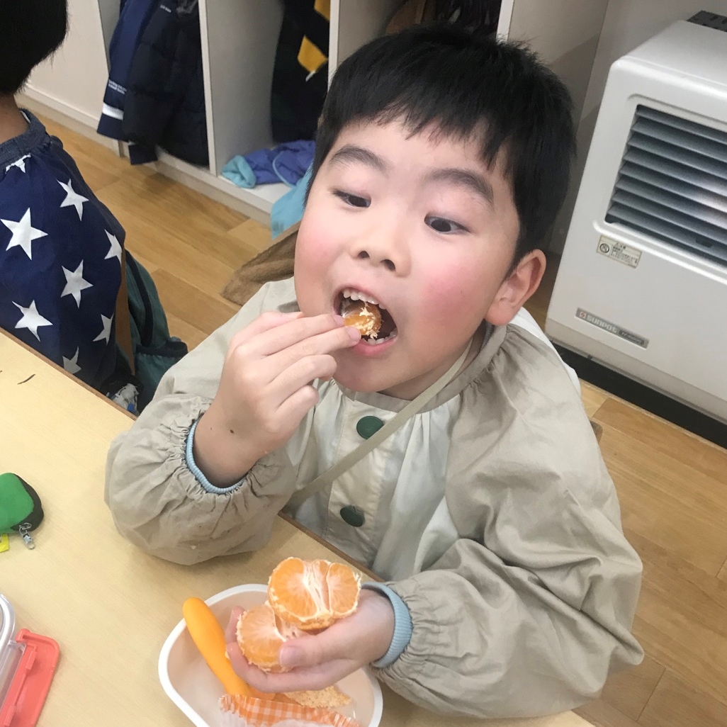 「やったことない!」と一人で全部皮を剥いて食べるのが初めのお友だちや「簡単だよ!」とささっと剥き終わるお友だちなど様々でしが、剥き終わったみかんをお口に入れると「あま~い!」「おいしいね💕」とみんなで味わいながらいただきました。