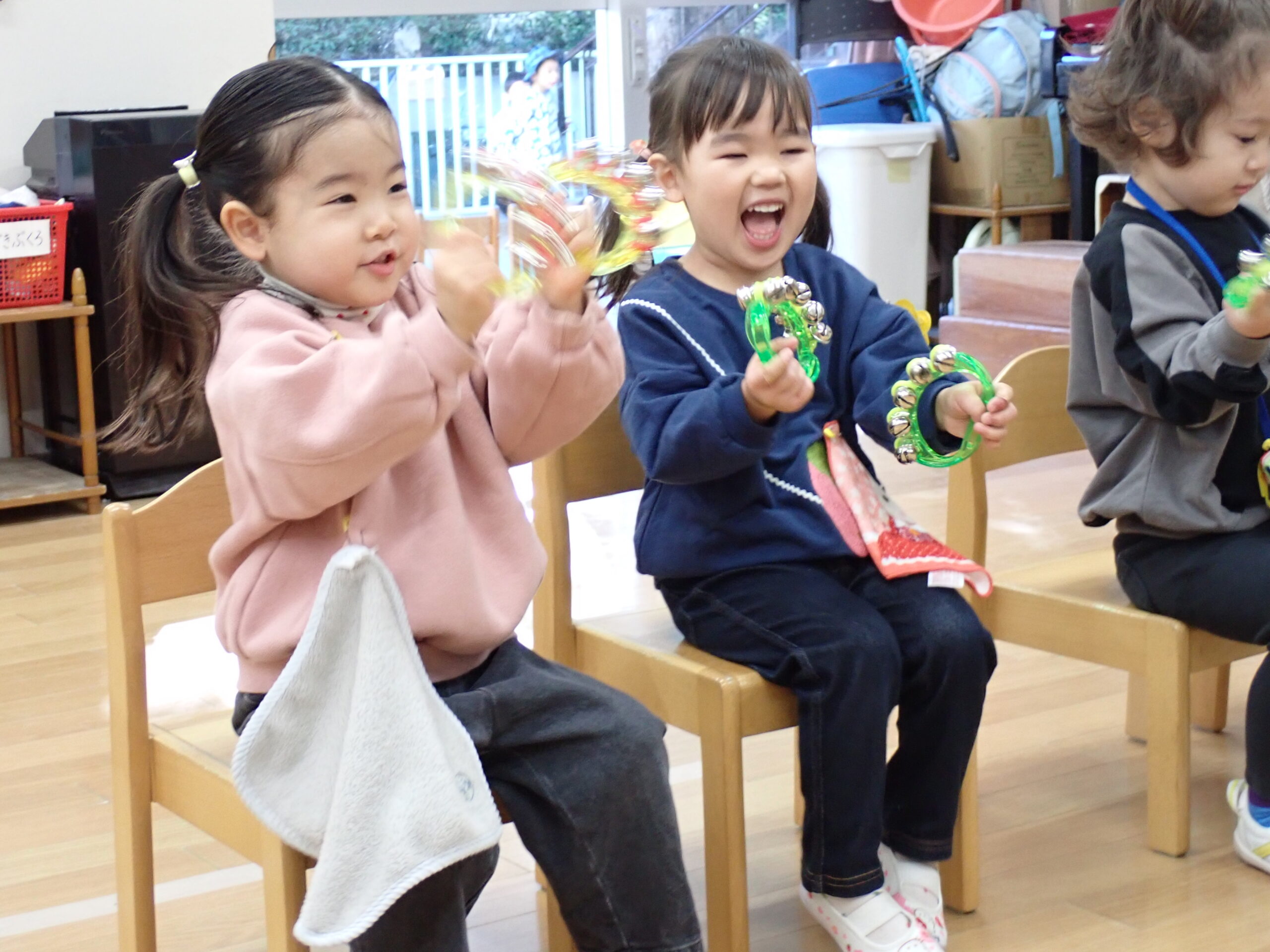 少しずつ幼稚園に慣れてきたので、今日は鈴をお渡ししてみんなで鳴らしす楽器あそびをしました!