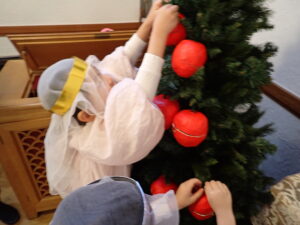 礼拝が始まる前に、毎日少しずつ本物のリンゴに和紙を貼って1ヶ月ほどかけて完成させたリンゴのオーナメント🍎を礼拝堂にある大きなクリスマスツリーに自分で飾ります。みんなのリンゴが飾られると、とっても素敵なクリスマスツリーが出来上がりました!