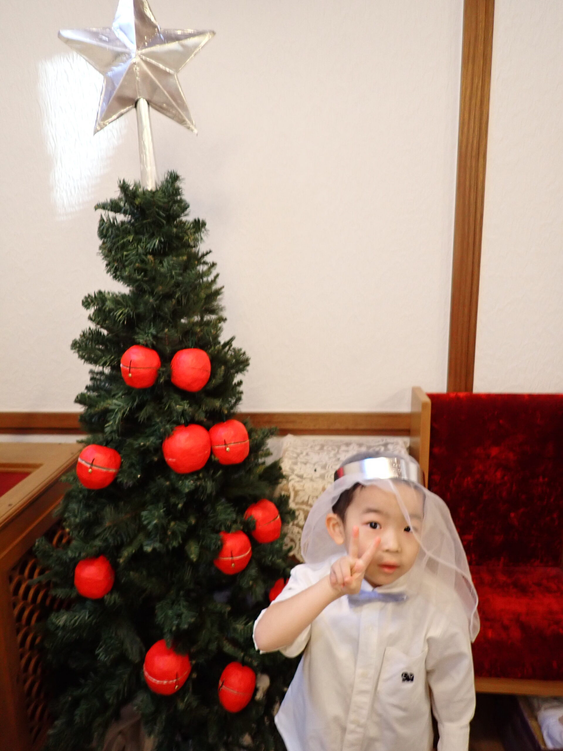 礼拝が始まる前に、毎日少しずつ本物のリンゴに和紙を貼って1ヶ月ほどかけて完成させたリンゴのオーナメント🍎を礼拝堂にある大きなクリスマスツリーに自分で飾ります。みんなのリンゴが飾られると、とっても素敵なクリスマスツリーが出来上がりました!