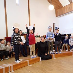 イエス様のお誕生をお祝いするために年少さん、年中さん、年長さんは楽しい劇を用意してくれました😊