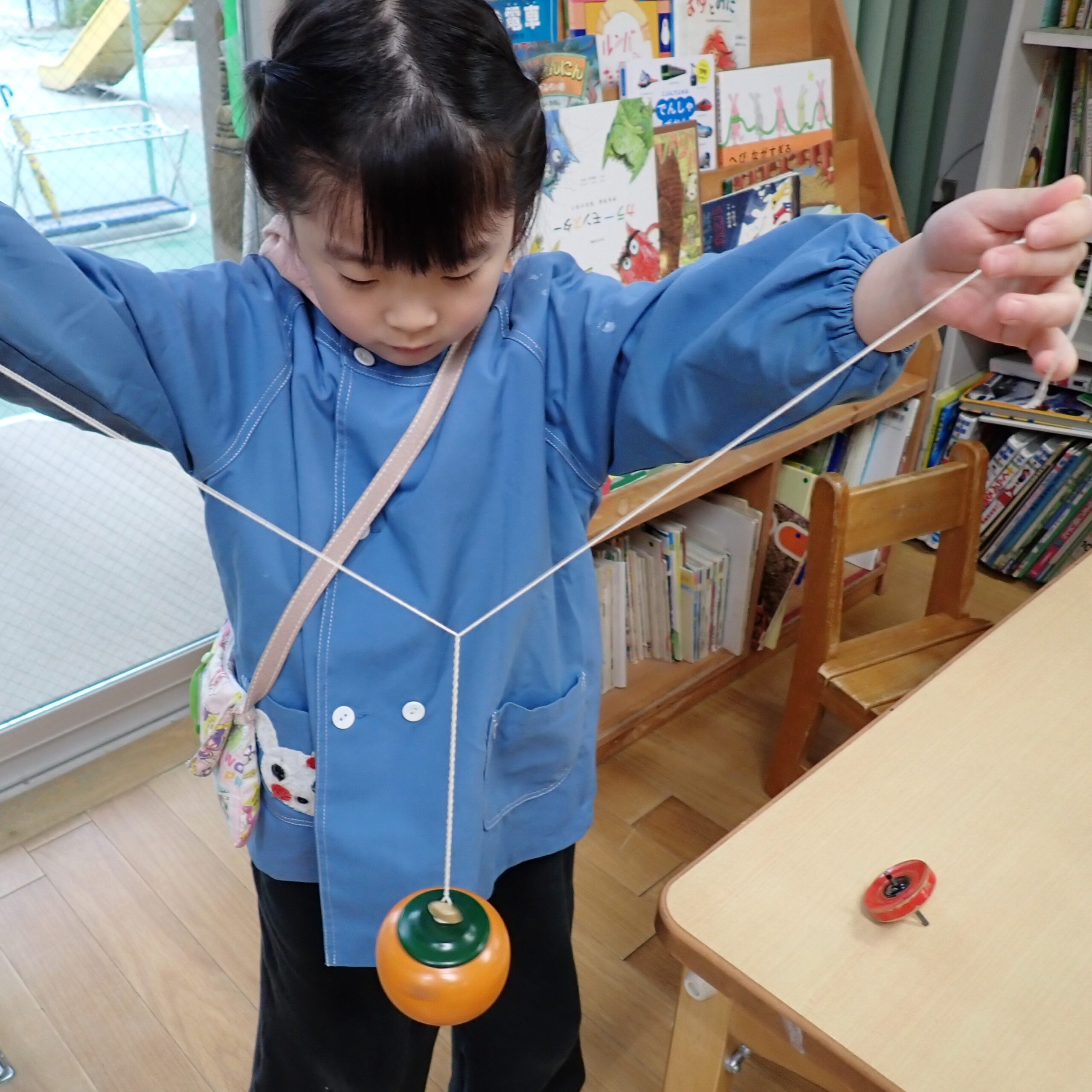 指で回せるものや、紐を使ってまわすものなど色々な種類の独楽があるので上手に回せると「みて~!!」ととっても嬉しそうです😊