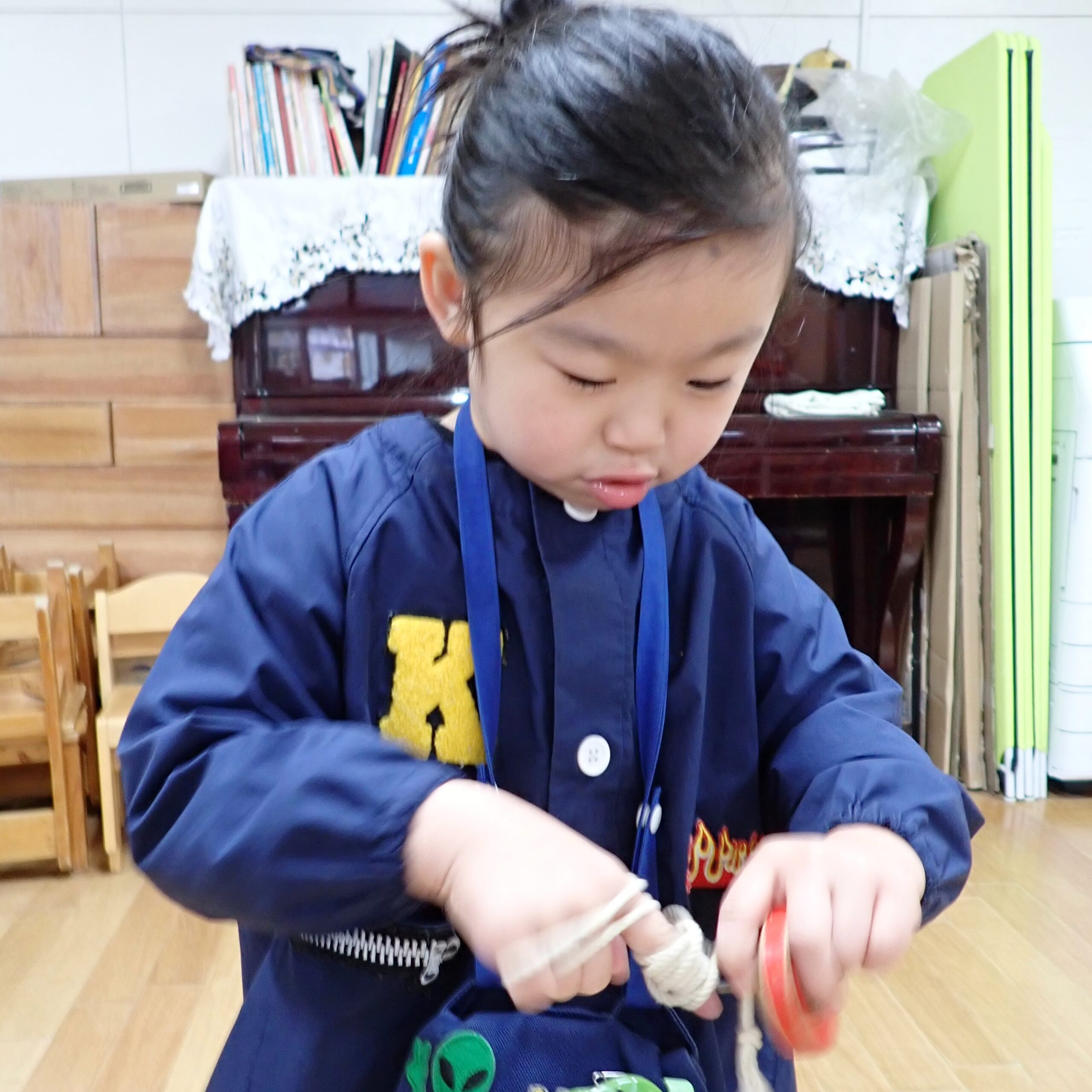 まだまだ独楽の紐を巻くのが難しいですが、失敗してもすぐに巻き直して何度も挑戦しています👏