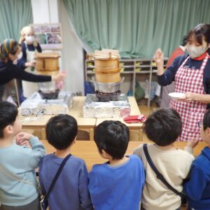 年長さんは「お餅って何から出来ているのかな?どうやったら出来るのかな?」と考えてもらって特別にもち米を蒸しているところを見学した後に自分の手にもち米を少しのせていただいて手でつぶしてみるという活動をしました。
