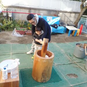 2歳児クラスさんから年長さんまでお家の方と一緒にお餅をつく経験をしました