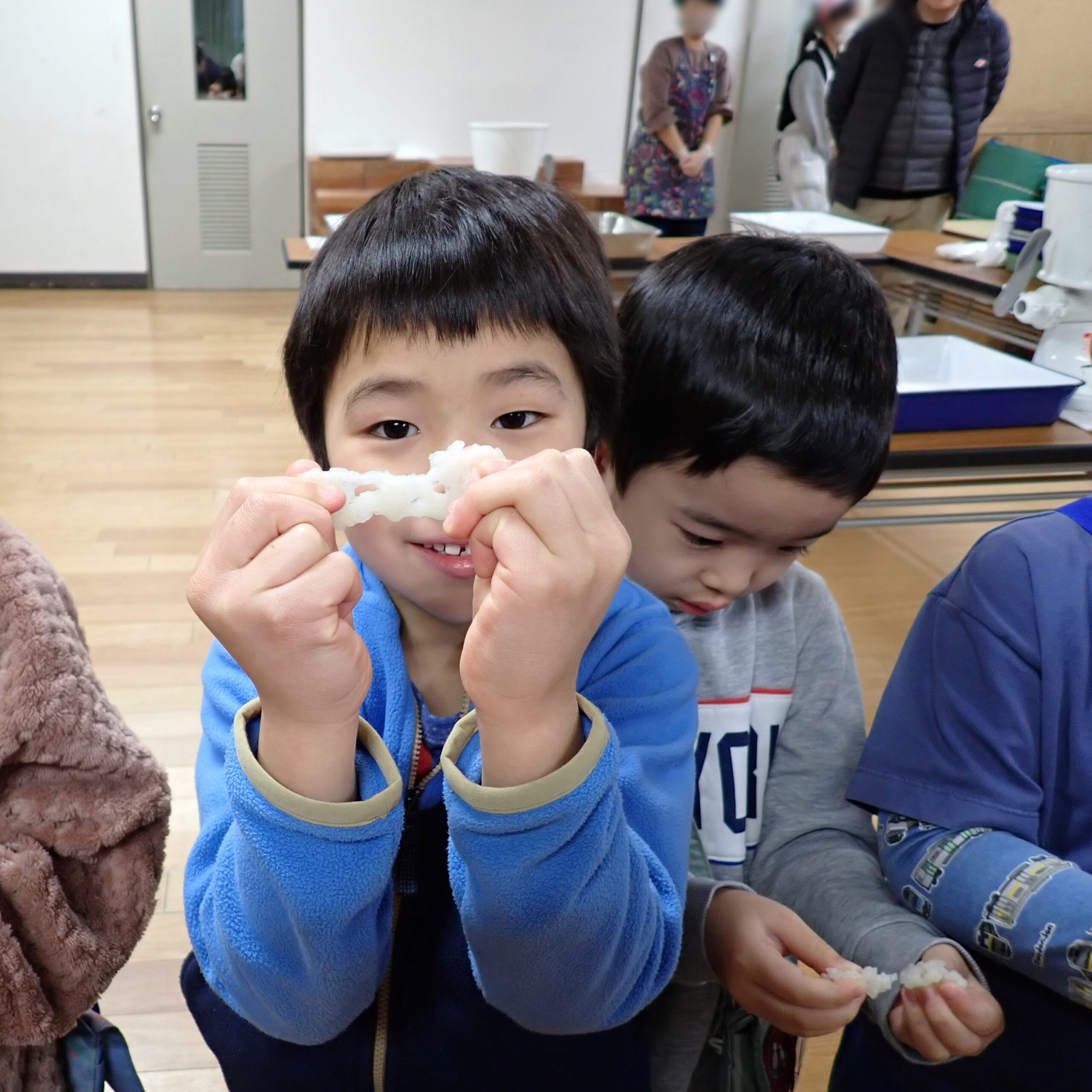 「みて!ちょっとのびるよ~!」とお米からお餅になるのを実際に感じることが出来ました!