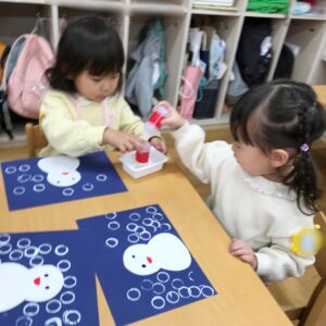 先日、城西幼稚園:2歳児プレクラス【つくしぐみ】のお友だちは、かわいい雪だるま⛄さんをつくりました!