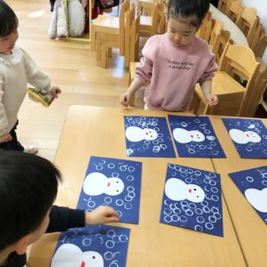 最後に、絵の具スタンプで雪だるまの周りに雪を降らせると「いっぱーい!」と絵の具スタンプを楽しんでいました😊