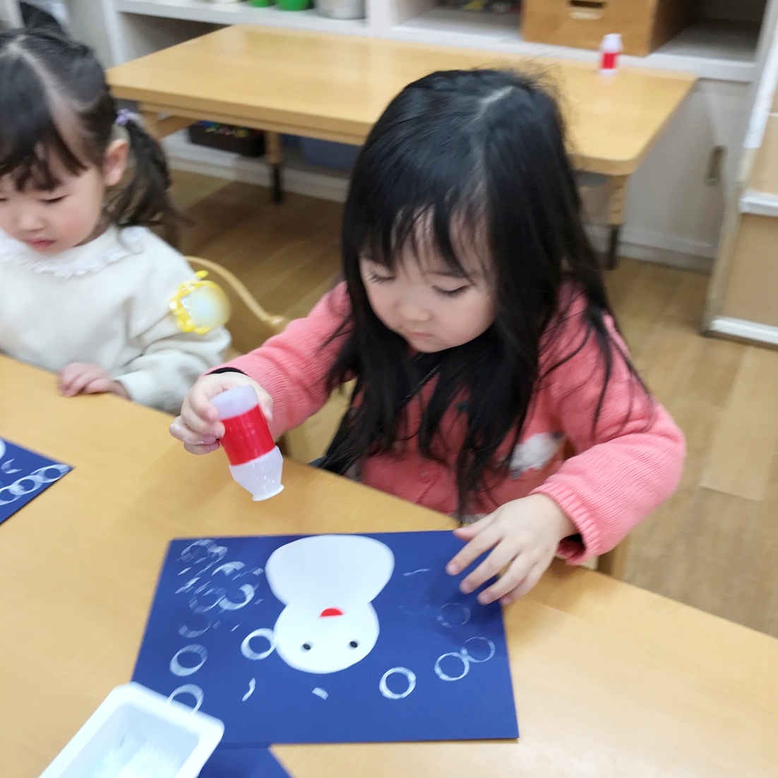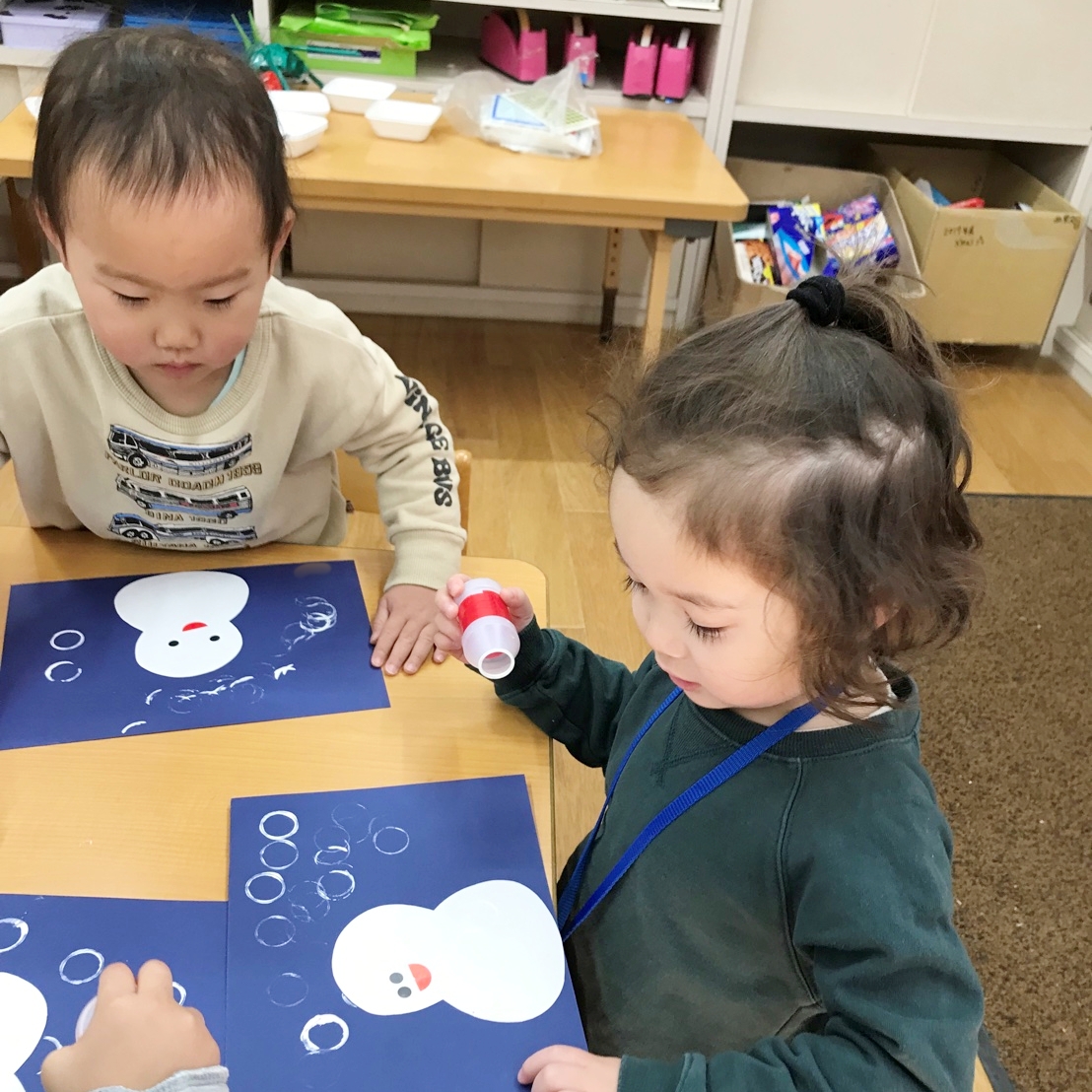 最後に、絵の具スタンプで雪だるまの周りに雪を降らせると「いっぱーい!」と絵の具スタンプを楽しんでいました😊