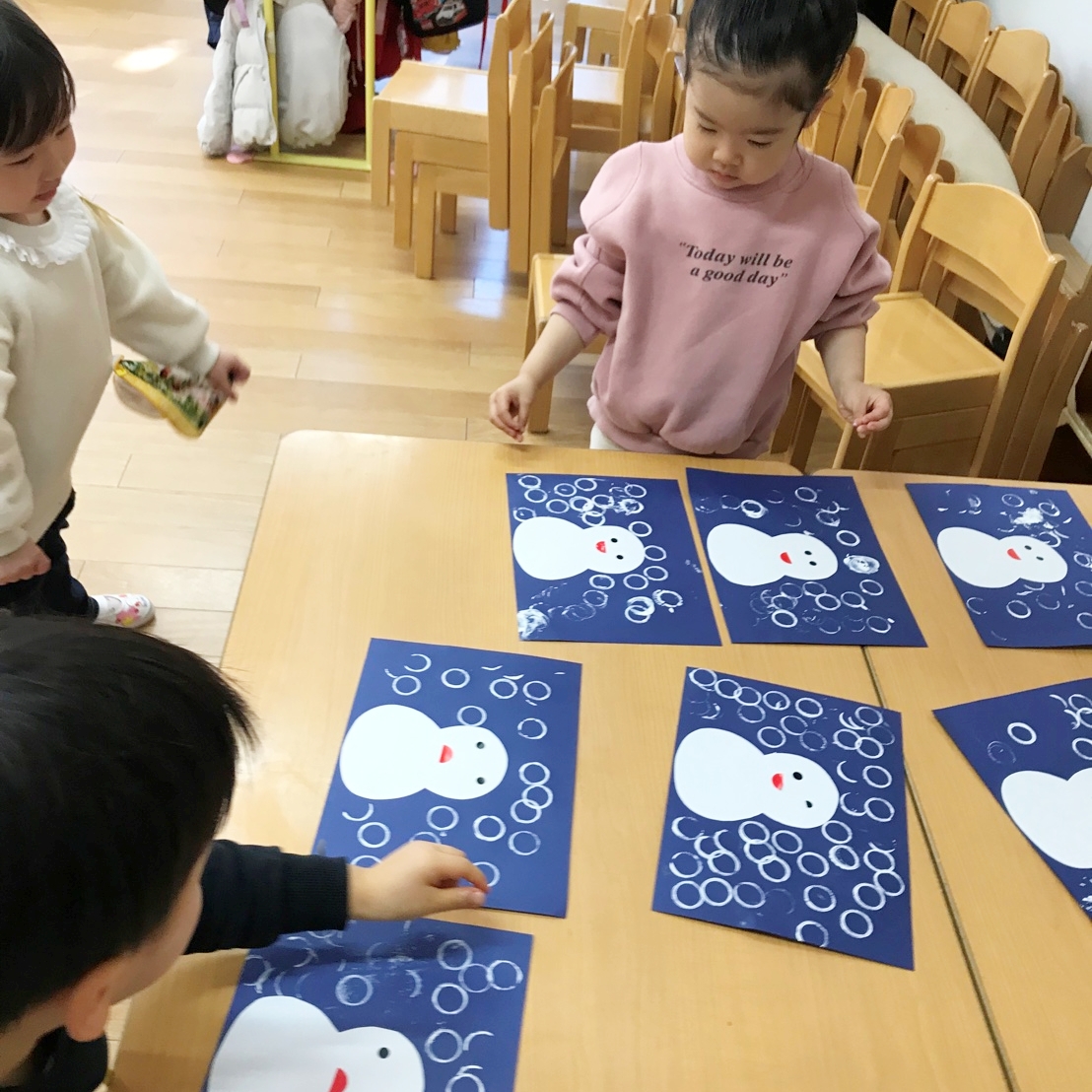 絵の具を乾かすために並べておくと、「すごいね~!」とお友だちや自分の雪だるまをみていました👏