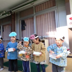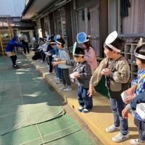 今年も3人の鬼が登場しました❗少しドキドキしたお友だちもいましたが、みんなで大きな声で「おには~そと!ふくは~うち!」とお豆をまきました👏