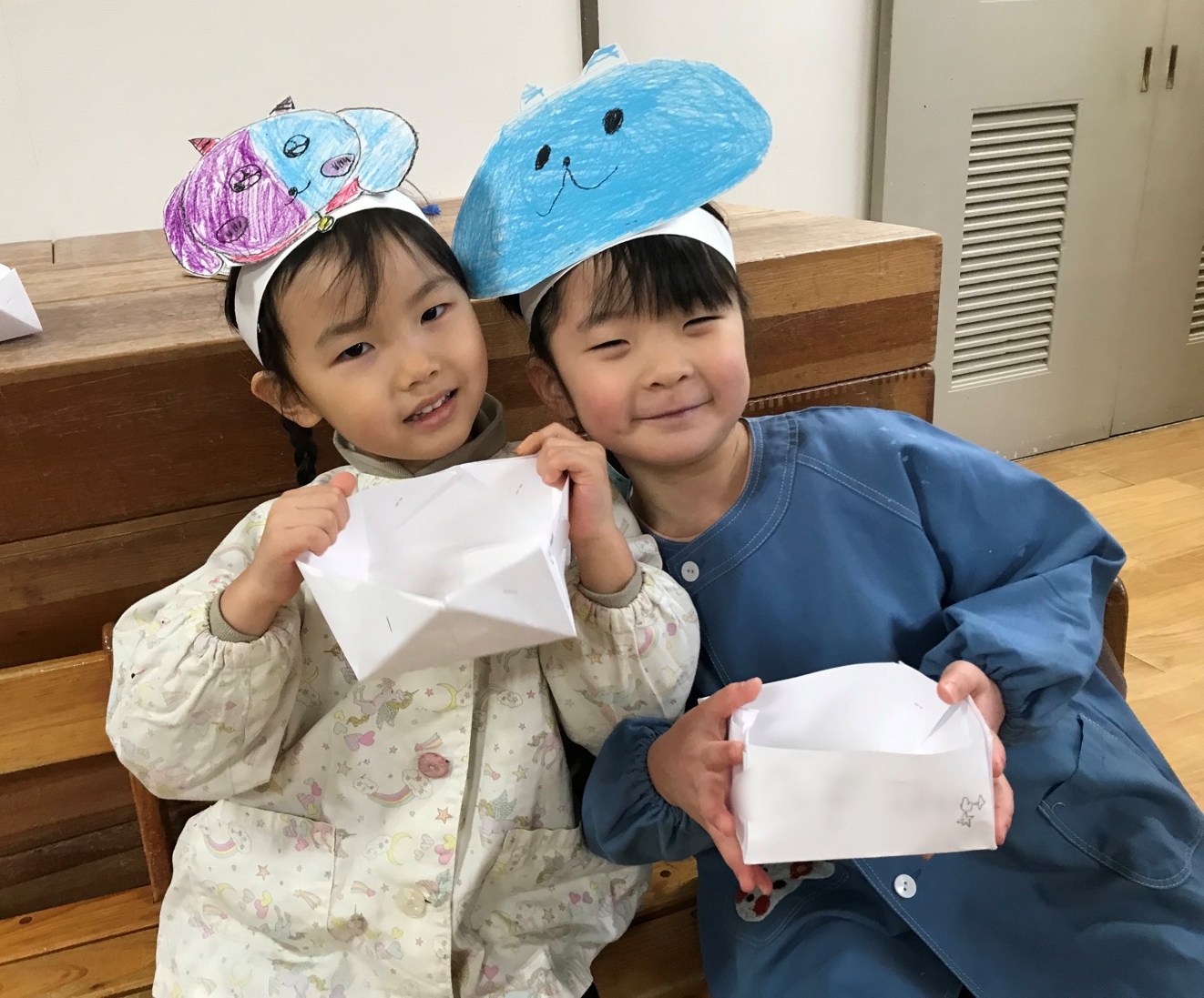自分で描いた鬼のお面👹をかぶって、自分作った枡にお豆をいれていざ鬼が来る園庭へ!!